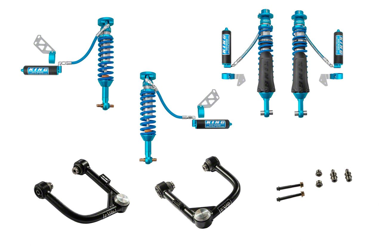 Control. The addition of King 2.50-inch Coil-Overs to this EVO Manufacturing 2 to 2.50-inch Enforce Stage 1 Control Arm Suspension Lift Kit takes your Bronco's handling to a whole new level. These premium coil-overs provide you with exact control over your vehicle's suspension, improving cornering stability and control both on and off the road.