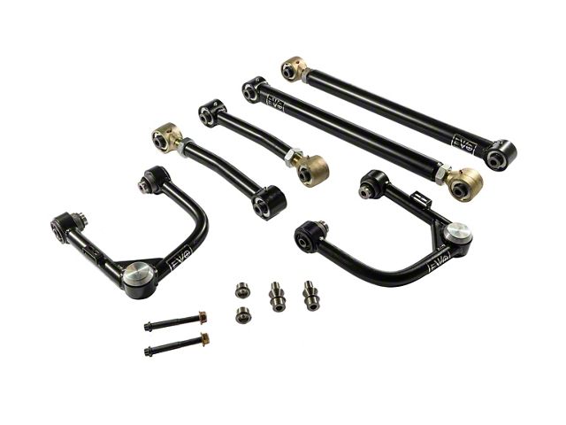 Complete Control Arm Kit. Elevate your Bronco's off-roading capabilities with the EVO Manufacturing Enforce Stage 3 Adjustable Front Upper, Rear Upper and Rear Lower Control Arms. This comprehensive kit offers a complete solution to fine-tune your suspension, providing enhanced control and performance on any terrain. The Stage 3 kit includes adjustable front upper, rear upper, and rear lower control arms, allowing you to optimize your suspension setup for improved handling and performance.