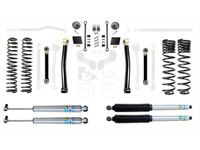 Construction and Appearance. This lift kit is crafted from durable components, including Bilstein shocks, coil springs, and control arm brackets, ensuring reliable and long-lasting performance. Featuring a glossy black and polished chrome finish, the kit is both stylish and rugged, adding an aggressive look to your Jeep while protecting the components against rust and wear.