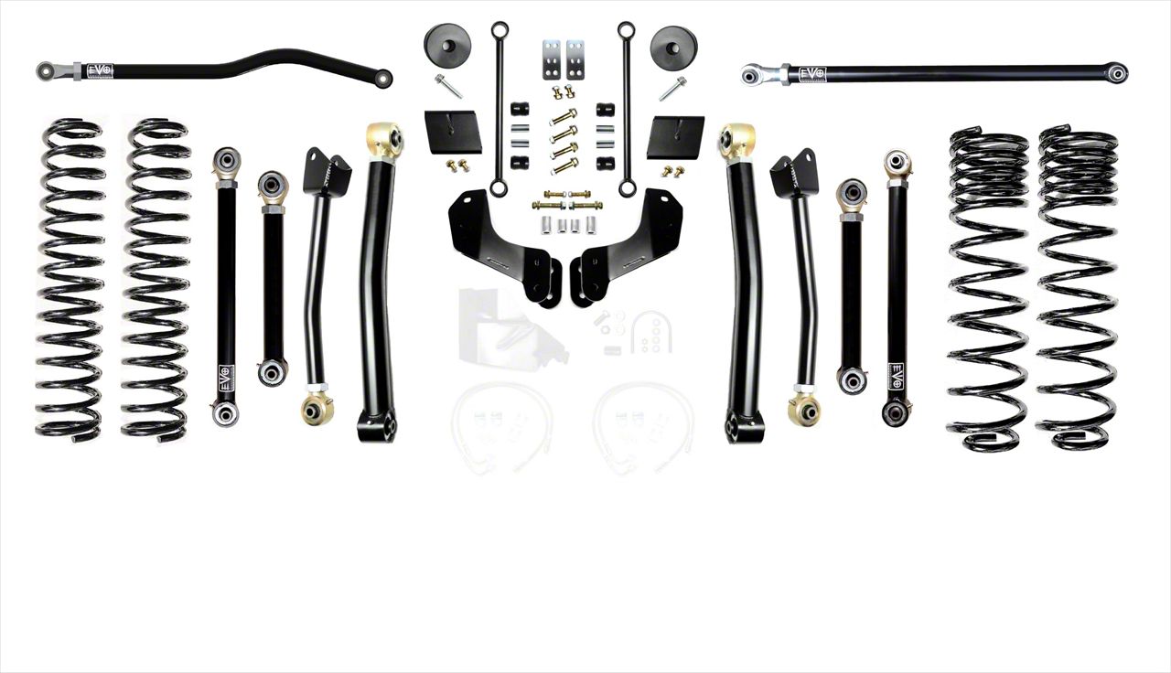 Description. The EVO MFG 2.5 Jeep Gladiator JT Enforcer Suspension Systems lift your 2020+ Jeep Gladiator JT 2.5s. The JT Enforcer kits are specifically designed and engineered to lift your JL and maintain a performance spring rate, smooth ride quality all while retaining tow capacities. These kits allow for use of your choice of any aftermarket 2.5-5 lift shock or use of our EVO SPEC tuned 2.5 Remote Reservoir King Shocks. These kits come with a set of 2.5 lift springs specific to each corner which will keep the Jeep Gladiator JT level side to side. The EVO MFG 2.5" JT Enforcer Kits are easy to install using normal tools. No drilling or cutting. They require no driveshaft or exhaust modifications. Simple Bolt on installation. EVO MFG JT Enforcer kits are available in multiple configurations to suit your needs and budget and are upgradable down the road. Stage 1 kits includes all the necessary parts to lift your JT 2.5s. Stage 2 kits includes Stage 1 components as well as EVO MFG Enforcer Front Lower Adjustable Control Arms to allow for caster adjustments. Stage 3 Kits includes stage 2 components as well as EVO MFG Enforcer rear upper adjustable control arms for rear pinion angle adjustment. Stage 4 kits includes stages 1 components with all 8 EVO MFG Enforcer control arms for full front and rear axle adjustments. All included Enforcer Arms use only rebuildable free articulating spherical bearings on all ends of each arm giving restriction free travel and articulation. The included Enforcer arms are manufactured from large diameter, thick DOM Steel Tubing for ultimate in strength and longevity both on and off the trail. These kits require wheel spacers or aftermarket wheels with smaller backspacing. Front and rear adjustable trackbars to fine tune axle center are included with PLUS “P kits. “K Kits include a set of 4 EVO SPEC King Shocks.Â
