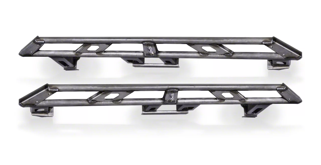 Secure and Protective. Made for the Jeep Gladiator JT, these EVO Manufacturing Rock Sliders come in a raw steel finish. Crafted from 2-inch DOM steel tubing, these sliders protect your ride from minor dings and hits while offering secure steps when exiting or climbing into your cab.