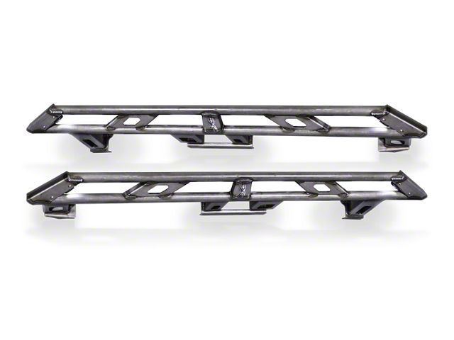 Undercarriage Protector. Conquer the off-road with safety and confidence with the EVO Manufacturing Weld-On Rock Sliders with Rock Lights in Bare Steel. This pair of rock sliders protect the vulnerable undercarriage area of your Jeep. It comes with a pair of rock lights (one on each end of the slider) for added visibility off the road.