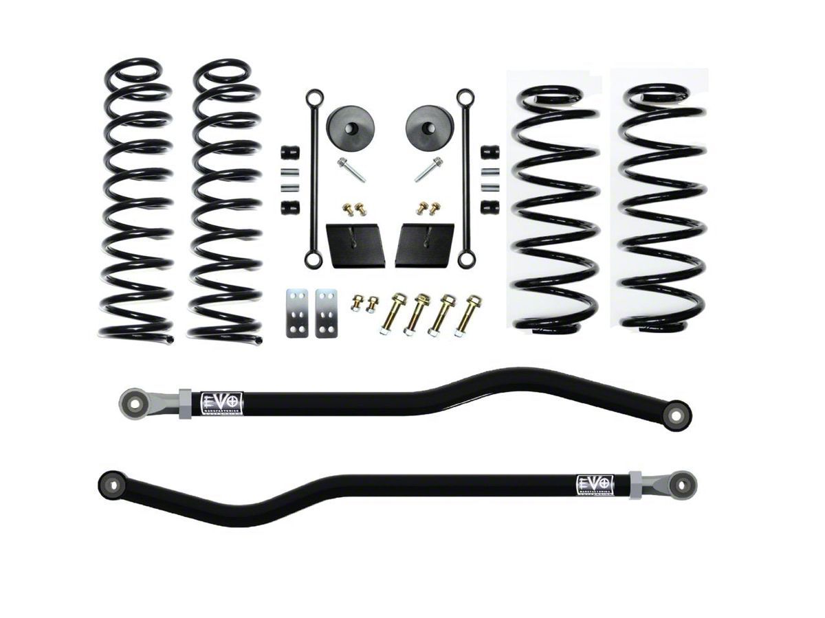 Description. The EVO MFG 2.5” JL Enforcer Lift Suspension Systems lift your 2018+ Jeep Wrangler JL 2.5”s. Our main goal in developing this kit was to give a smooth ride on and off road while giving additional lift with increased performance. The JL Enforcer kits are specifically designed to lift your JL and maintain compliant spring rate, smooth ride quality while having the option of retaining factory shocks, maintaining full wheel travel with use of shock extensions (part number EXT kits) or without shock extensions to allow for use of your choice of aftermarket 2/2.5” lift shocks. These kits come with a set of 2.5” Plush Ride Lift springs specific to each corner which will keep the Jeep Wrangler JL Level side to side and will maintain a unique and compliant ride quality. EVO MFG JL Enforcer kits are available in multiple configurations to suit your needs and budget and are upgradable down the road. These Enforcer kits will fit up to a 37” tires on Rubicon Model JLs or 35” tires on Sahara and Sport/S. The EVO MFG 2.5" JL Enforcer Kits are easy to install using normal tools. No drilling or cutting (optional rear shock extensions require one minor drill). They require no driveshaft or exhaust modifications (your shock choice may require this, contact manufacturer to be sure). Simple Bolt on installation. 2.5” lift is based on increase of a 4 Door Rubicon. 4 Door Sport and Sahara Models will see slightly higher increases over stock and will match overall lift height of a Rubicon Model. 2 Door Models (all) will see slightly higher increases in lift. Increases will vary. Stage 1 kits includes all the necessary parts to lift your JL 2.5”s. Stage 2 kits includes Stage 1 components as well as EVO MFG Enforcer JL Front Lower Adjustable Control Arms to allow for caster adjustments. Stage 3 Kits includes stage 2 components as well as EVO MFG Enforcer rear upper adjustable control arms for rear pinion angle adjustment Stage 4 kits includes stages 1 components with all 8 EVO MFG Enforcer control arms for full front and rear axle adjustments. *All part number “EXT” kits include front and rear shock extensions. Retaining factory shocks while maintaining full wheel travel Note: Depending on actual tire variances and sizes, Some minor factory inner liner plastic may need to trimmed/removed to fully clear some tires under compression. These kits require wheel spacers or aftermarket wheels with smaller backspacing. Front and rear adjustable trackbars are included with PLUS “P” kits.