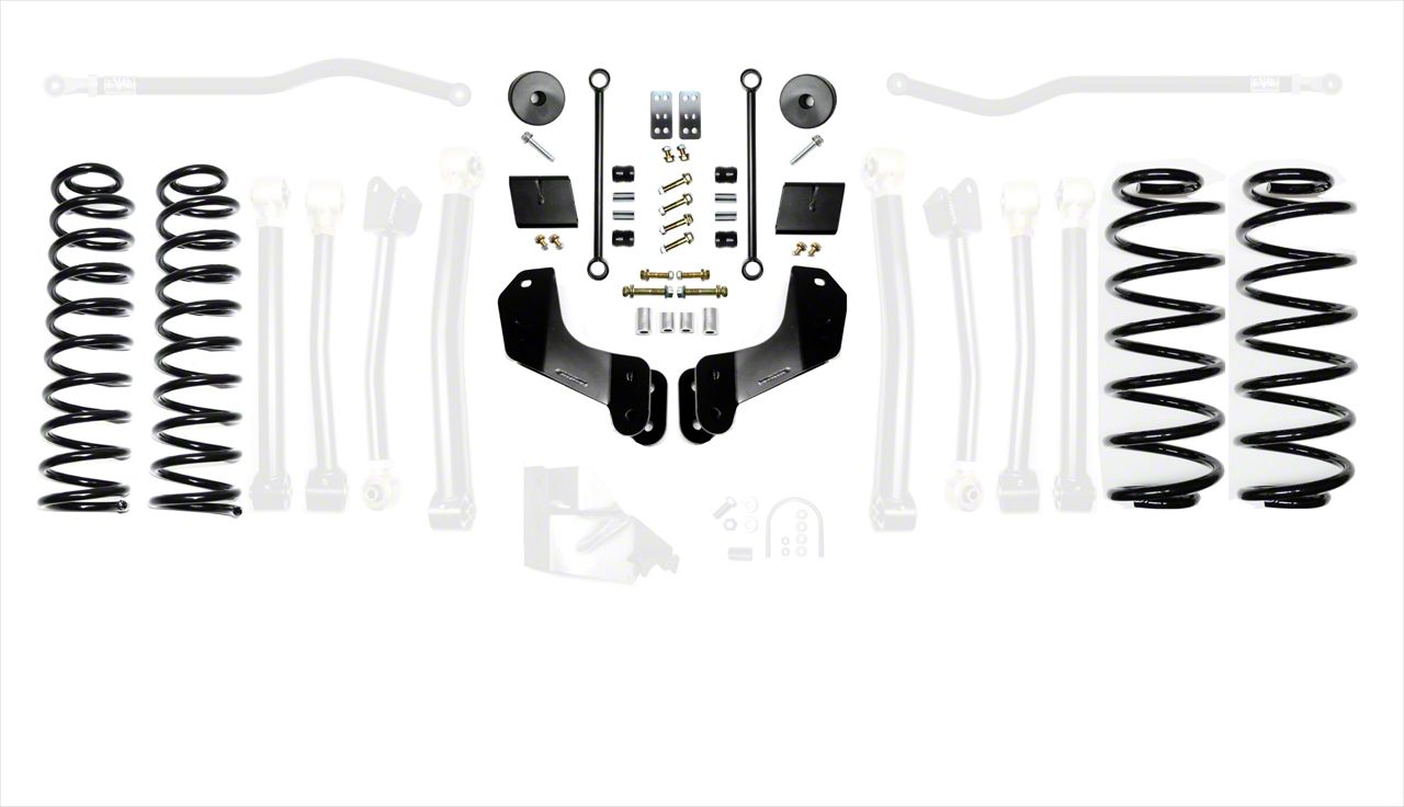 Description. The EVO MFG 2.5” JL Enforcer Lift Suspension Systems lift your 2018+ Jeep Wrangler JL 2.5”s. Our main goal in developing this kit was to give a smooth ride on and off road while giving additional lift with increased performance. The JL Enforcer kits are specifically designed to lift your JL and maintain compliant spring rate, smooth ride quality while having the option of retaining factory shocks, maintaining full wheel travel with use of shock extensions (part number EXT kits) or without shock extensions to allow for use of your choice of aftermarket 2/2.5” lift shocks. These kits come with a set of 2.5” Plush Ride Lift springs specific to each corner which will keep the Jeep Wrangler JL Level side to side and will maintain a unique and compliant ride quality. EVO MFG JL Enforcer kits are available in multiple configurations to suit your needs and budget and are upgradable down the road. These Enforcer kits will fit up to a 37” tires on Rubicon Model JLs or 35” tires on Sahara and Sport/S What are the JL Enforcer OVERLAND Systems, EVO-3012 Kits? The difference with EVO MFG Enforcer Overland systems (EVO-3012s) vs EVO MFG Enforcer systems (EVO-3011s) is the use of front Overland Control Arm Brackets. When lifting your vehicle your control arms at ride height have a steeper angle towards the floor which can have some negative effect/chop in ride quality. With the use of the included Overland Control Arm brackets we relocate the front control arm mounting locations at the frame. In doing this when lifted we maintain factory flatter control arm angles and while minimal, we alleviate much of the chop associated with lifting a Jeep giving even better and more improved ride quality. Also, in the use of Overland Drop Brackets we are able to engineer more performance into the front suspension to improve braking and driveline angles through suspension cycle. Both kits drive very well, the Overland Kits are better suited for less hard off-road crawling and more light off road and on road use. The EVO MFG 2.5" JL Enforcer Overland Kits are easy to install using normal tools. No drilling or cutting (optional rear shock extensions require one minor drill). They require no driveshaft or exhaust modifications (your shock choice may require this, contact manufacturer to be sure). Simple Bolt on installation. 2.5” lift is based on increase of a 4 Door Rubicon. 4 Door Sport and Sahara Models will see slightly higher increases over stock and will match overall lift height of a Rubicon Model. 2 Door Models (all) will see slightly higher increases in lift. Increases will vary. Stage 1 kits includes all the necessary parts to lift your JL 2.5”s. Stage 2 kits includes Stage 1 components as well as EVO MFG Enforcer JL Front Lower Adjustable Control Arms to allow for caster adjustments. Stage 3 Kits includes stage 2 components as well as EVO MFG Enforcer rear upper adjustable control arms for rear pinion angle adjustment Stage 4 kits includes stages 1 components with all 8 EVO MFG Enforcer control arms for full front and rear axle adjustments. *All part number “EXT” kits include front and rear shock extensions. Retaining factory shocks while maintaining full wheel travel Note: Depending on actual tire variances and sizes, Some minor factory inner liner plastic may need to trimmed/removed to fully clear some tires under compression. These kits require wheel spacers or aftermarket wheels with smaller backspacing. Front and rear adjustable trackbars are included with PLUS “P” kits.