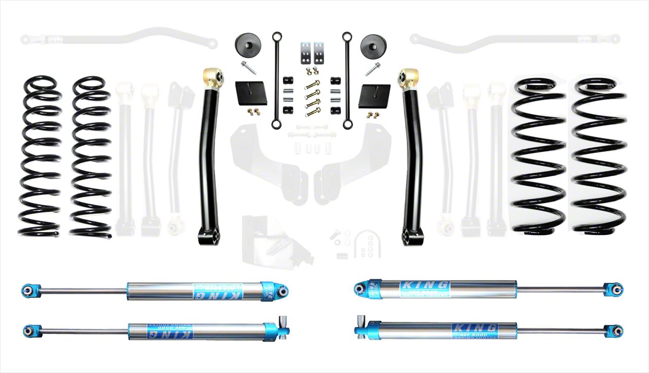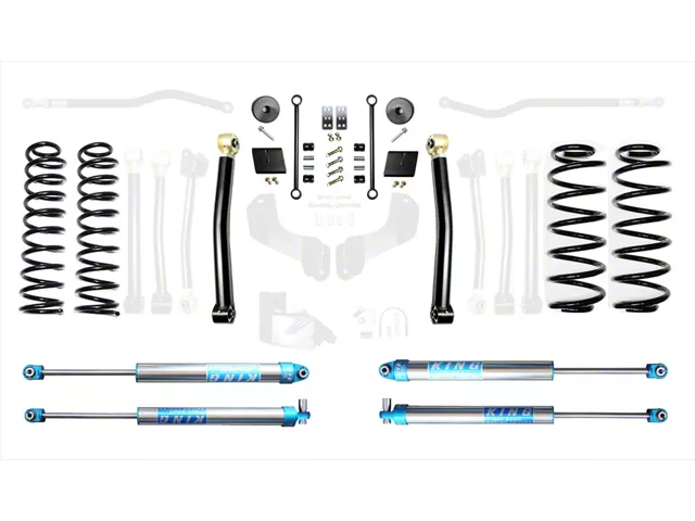 Construction and Features. This kit features King 2.0 shocks, adjustable control arms, and coil springs crafted for durability and performance. The combination of glossy black, polished chrome, metallic blue, and matte black finishes adds a stylish touch to your Jeep. Its high-quality components ensure enhanced handling and stability on all terrains.