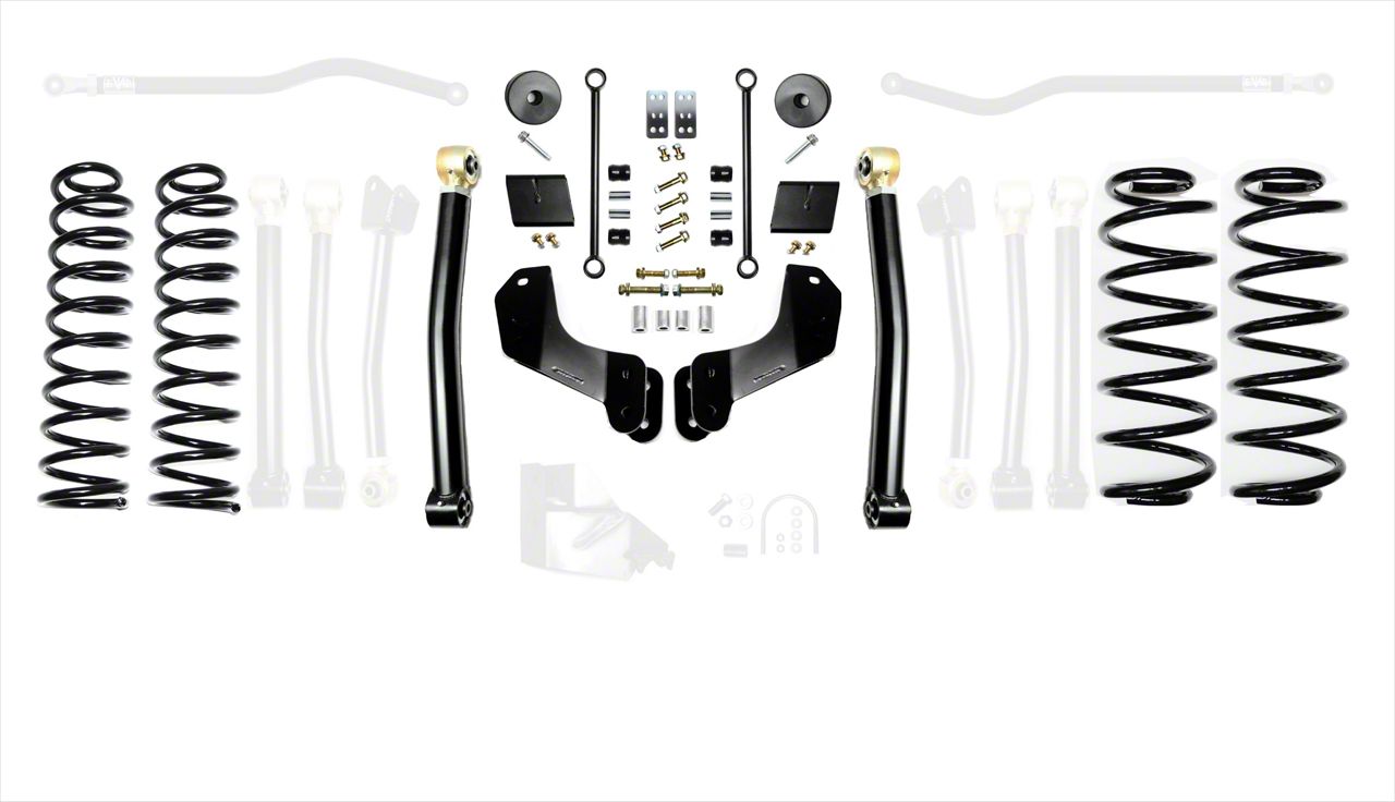 Description. The EVO MFG 2.5” JL Enforcer Lift Suspension Systems lift your 2018+ Jeep Wrangler JL 2.5”s. Our main goal in developing this kit was to give a smooth ride on and off road while giving additional lift with increased performance. The JL Enforcer kits are specifically designed to lift your JL and maintain compliant spring rate, smooth ride quality while having the option of retaining factory shocks, maintaining full wheel travel with use of shock extensions (part number EXT kits) or without shock extensions to allow for use of your choice of aftermarket 2/2.5” lift shocks. These kits come with a set of 2.5” Plush Ride Lift springs specific to each corner which will keep the Jeep Wrangler JL Level side to side and will maintain a unique and compliant ride quality. EVO MFG JL Enforcer kits are available in multiple configurations to suit your needs and budget and are upgradable down the road. These Enforcer kits will fit up to a 37” tires on Rubicon Model JLs or 35” tires on Sahara and Sport/S What are the JL Enforcer OVERLAND Systems, EVO-3012 Kits? The difference with EVO MFG Enforcer Overland systems (EVO-3012s) vs EVO MFG Enforcer systems (EVO-3011s) is the use of front Overland Control Arm Brackets. When lifting your vehicle your control arms at ride height have a steeper angle towards the floor which can have some negative effect/chop in ride quality. With the use of the included Overland Control Arm brackets we relocate the front control arm mounting locations at the frame. In doing this when lifted we maintain factory flatter control arm angles and while minimal, we alleviate much of the chop associated with lifting a Jeep giving even better and more improved ride quality. Also, in the use of Overland Drop Brackets we are able to engineer more performance into the front suspension to improve braking and driveline angles through suspension cycle. Both kits drive very well, the Overland Kits are better suited for less hard off-road crawling and more light off road and on road use. The EVO MFG 2.5" JL Enforcer Overland Kits are easy to install using normal tools. No drilling or cutting (optional rear shock extensions require one minor drill). They require no driveshaft or exhaust modifications (your shock choice may require this, contact manufacturer to be sure). Simple Bolt on installation. 2.5” lift is based on increase of a 4 Door Rubicon. 4 Door Sport and Sahara Models will see slightly higher increases over stock and will match overall lift height of a Rubicon Model. 2 Door Models (all) will see slightly higher increases in lift. Increases will vary. Stage 1 kits includes all the necessary parts to lift your JL 2.5”s. Stage 2 kits includes Stage 1 components as well as EVO MFG Enforcer JL Front Lower Adjustable Control Arms to allow for caster adjustments. Stage 3 Kits includes stage 2 components as well as EVO MFG Enforcer rear upper adjustable control arms for rear pinion angle adjustment Stage 4 kits includes stages 1 components with all 8 EVO MFG Enforcer control arms for full front and rear axle adjustments. *All part number “EXT” kits include front and rear shock extensions. Retaining factory shocks while maintaining full wheel travel Note: Depending on actual tire variances and sizes, Some minor factory inner liner plastic may need to trimmed/removed to fully clear some tires under compression. These kits require wheel spacers or aftermarket wheels with smaller backspacing. Front and rear adjustable trackbars are included with PLUS “P” kits.