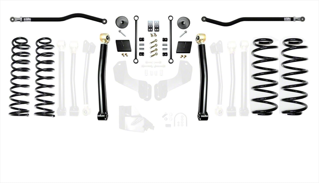 The EVO MFG 2.5” JL Enforcer Lift Suspension Systems lift your 2018+ Jeep Wrangler JL 2.5”s. Our main goal in developing this kit was to give a smooth ride on and off road while giving additional lift with increased performance.  The JL Enforcer kits are specifically designed to lift your JL and maintain compliant spring rate, smooth ride quality while having the option of retaining factory shocks, maintaining full wheel travel with use of shock extensions (part number EXT kits) or without shock extensions to allow for use of your choice of aftermarket 2/2.5” lift shocks. These kits come with a set of 2.5” Plush Ride Lift springs specific to each corner which will keep the Jeep Wrangler JL Level side to side and will maintain a unique and compliant ride quality. EVO MFG JL Enforcer kits are available in multiple configurations to suit your needs and budget and are upgradable down the road. These Enforcer kits will fit up to a 37” tires on Rubicon Model JLs or 35” tires on Sahara and Sport/S. The EVO MFG 2.5" JL Enforcer Kits are easy to install using normal tools. No drilling or cutting (optional rear shock extensions require one minor drill). They require no driveshaft or exhaust modifications (your shock choice may require this, contact manufacturer to be sure). Simple Bolt on installation. 2.5” lift is based on increase of a 4 Door Rubicon.  4 Door Sport and Sahara Models will see slightly higher increases over stock and will match overall lift height of a Rubicon Model.  2 Door Models (all) will see slightly higher increases in lift.  Increases will vary. Stage 1 kits includes all the necessary parts to lift your JL 2.5”s. Stage 2 kits includes Stage 1 components as well as EVO MFG Enforcer JL Front Lower Adjustable Control Arms to allow for caster adjustments. Stage 3 Kits includes stage 2 components as well as EVO MFG Enforcer rear upper adjustable control arms for rear pinion angle adjustment Stage 4 kits includes stages 1 components with all 8 EVO MFG Enforcer control arms for full front and rear axle adjustments. *All part number “EXT” kits include front and rear shock extensions. Retaining factory shocks while maintaining full wheel travel Note:  Depending on actual tire variances and sizes, Some minor factory inner liner plastic may need to trimmed/removed to fully clear some tires under compression.  These kits require wheel spacers or aftermarket wheels with smaller backspacing. Front and rear adjustable trackbars are included with PLUS “P” kits.