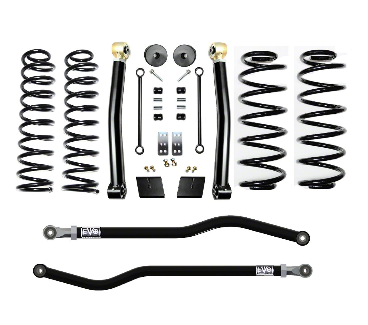 The EVO MFG 2.5” JL Enforcer Lift Suspension Systems lift your 2018+ Jeep Wrangler JL 2.5”s. Our main goal in developing this kit was to give a smooth ride on and off road while giving additional lift with increased performance.  The JL Enforcer kits are specifically designed to lift your JL and maintain compliant spring rate, smooth ride quality while having the option of retaining factory shocks, maintaining full wheel travel with use of shock extensions (part number EXT kits) or without shock extensions to allow for use of your choice of aftermarket 2/2.5” lift shocks. These kits come with a set of 2.5” Plush Ride Lift springs specific to each corner which will keep the Jeep Wrangler JL Level side to side and will maintain a unique and compliant ride quality. EVO MFG JL Enforcer kits are available in multiple configurations to suit your needs and budget and are upgradable down the road. These Enforcer kits will fit up to a 37” tires on Rubicon Model JLs or 35” tires on Sahara and Sport/S. The EVO MFG 2.5" JL Enforcer Kits are easy to install using normal tools. No drilling or cutting (optional rear shock extensions require one minor drill). They require no driveshaft or exhaust modifications (your shock choice may require this, contact manufacturer to be sure). Simple Bolt on installation. 2.5” lift is based on increase of a 4 Door Rubicon.  4 Door Sport and Sahara Models will see slightly higher increases over stock and will match overall lift height of a Rubicon Model.  2 Door Models (all) will see slightly higher increases in lift.  Increases will vary. Stage 1 kits includes all the necessary parts to lift your JL 2.5”s. Stage 2 kits includes Stage 1 components as well as EVO MFG Enforcer JL Front Lower Adjustable Control Arms to allow for caster adjustments. Stage 3 Kits includes stage 2 components as well as EVO MFG Enforcer rear upper adjustable control arms for rear pinion angle adjustment Stage 4 kits includes stages 1 components with all 8 EVO MFG Enforcer control arms for full front and rear axle adjustments. *All part number “EXT” kits include front and rear shock extensions. Retaining factory shocks while maintaining full wheel travel Note:  Depending on actual tire variances and sizes, Some minor factory inner liner plastic may need to trimmed/removed to fully clear some tires under compression.  These kits require wheel spacers or aftermarket wheels with smaller backspacing. Front and rear adjustable trackbars are included with PLUS “P” kits.