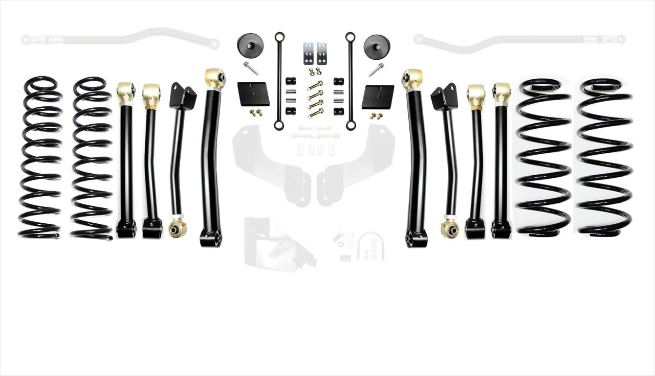 Description. The EVO MFG 2.5” JL Enforcer Lift Suspension Systems lift your 2018+ Jeep Wrangler JL 2.5”s. Our main goal in developing this kit was to give a smooth ride on and off road while giving additional lift with increased performance. The JL Enforcer kits are specifically designed to lift your JL and maintain compliant spring rate, smooth ride quality while having the option of retaining factory shocks, maintaining full wheel travel with use of shock extensions (part number EXT kits) or without shock extensions to allow for use of your choice of aftermarket 2/2.5” lift shocks. These kits come with a set of 2.5” Plush Ride Lift springs specific to each corner which will keep the Jeep Wrangler JL Level side to side and will maintain a unique and compliant ride quality. EVO MFG JL Enforcer kits are available in multiple configurations to suit your needs and budget and are upgradable down the road. These Enforcer kits will fit up to a 37” tires on Rubicon Model JLs or 35” tires on Sahara and Sport/S. The EVO MFG 2.5" JL Enforcer Kits are easy to install using normal tools. No drilling or cutting (optional rear shock extensions require one minor drill). They require no driveshaft or exhaust modifications (your shock choice may require this, contact manufacturer to be sure). Simple Bolt on installation. 2.5” lift is based on increase of a 4 Door Rubicon. 4 Door Sport and Sahara Models will see slightly higher increases over stock and will match overall lift height of a Rubicon Model. 2 Door Models (all) will see slightly higher increases in lift. Increases will vary. Stage 1 kits includes all the necessary parts to lift your JL 2.5”s. Stage 2 kits includes Stage 1 components as well as EVO MFG Enforcer JL Front Lower Adjustable Control Arms to allow for caster adjustments. Stage 3 Kits includes stage 2 components as well as EVO MFG Enforcer rear upper adjustable control arms for rear pinion angle adjustment Stage 4 kits includes stages 1 components with all 8 EVO MFG Enforcer control arms for full front and rear axle adjustments. *All part number “EXT” kits include front and rear shock extensions. Retaining factory shocks while maintaining full wheel travel Note: Depending on actual tire variances and sizes, Some minor factory inner liner plastic may need to trimmed/removed to fully clear some tires under compression. These kits require wheel spacers or aftermarket wheels with smaller backspacing. Front and rear adjustable trackbars are included with PLUS “P” kits.