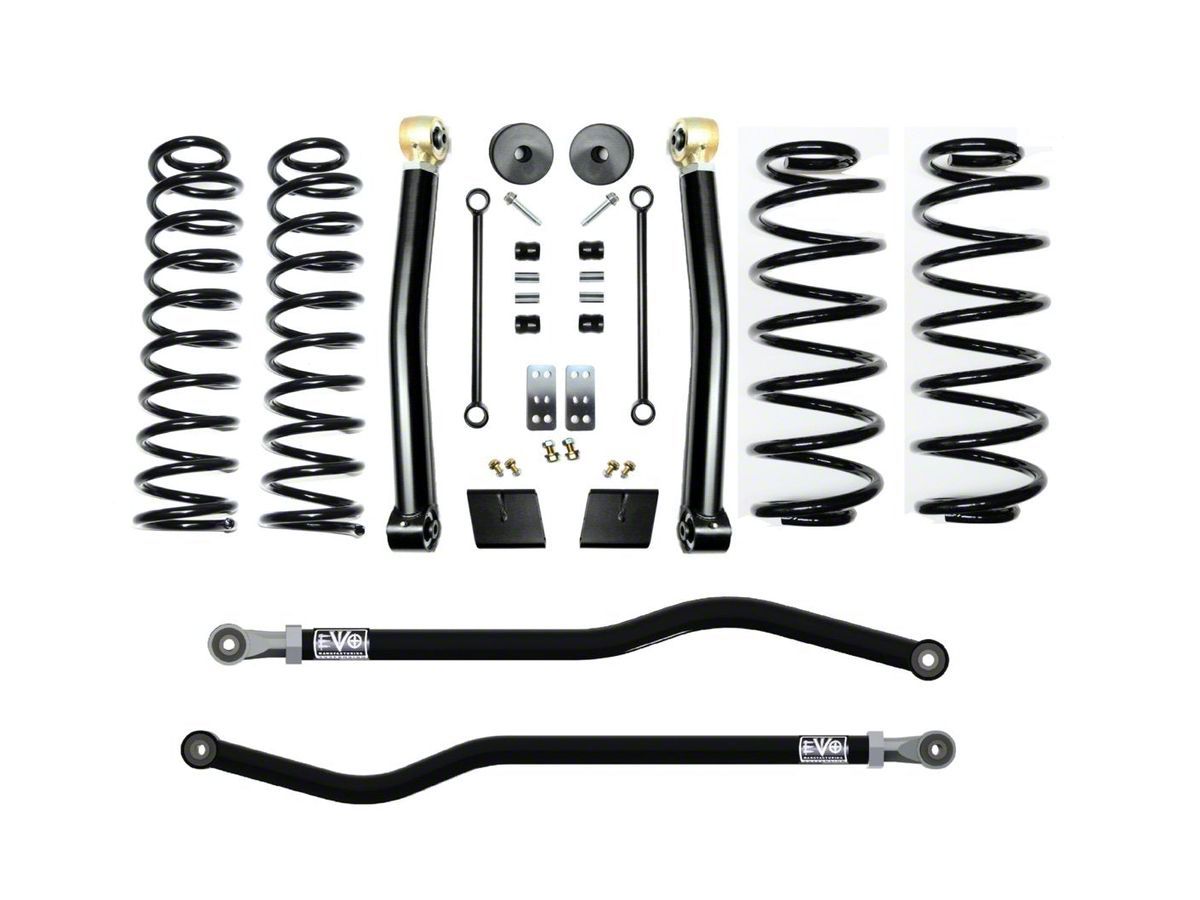 Application. The EVO Manufacturing 2.50-Inch Heavy Duty Enforcer Stage 2 PLUS Suspension Lift Kit fits 2018-2026 2.0L or 3.6L Jeep Wrangler JL models, excluding 4xe.