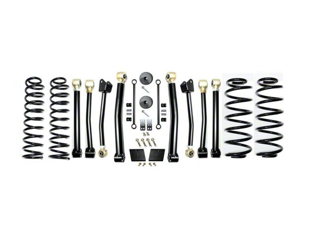 Description. The EVO MFG 2.5 JL Enforcer Lift Suspension Systems lift your 2018+ Jeep Wrangler JL 2.5s. Our main goal in developing this kit was to give a smooth ride on and off road while giving additional lift with increased performance. The JL Enforcer kits are specifically designed to lift your JL and maintain compliant spring rate, smooth ride quality while having the option of retaining factory shocks, maintaining full wheel travel with use of shock extensions (part number EXT kits) or without shock extensions to allow for use of your choice of aftermarket 2/2.5 lift shocks. These kits come with a set of 2.5 Plush Ride Lift springs specific to each corner which will keep the Jeep Wrangler JL Level side to side and will maintain a unique and compliant ride quality. EVO MFG JL Enforcer kits are available in multiple configurations to suit your needs and budget and are upgradable down the road. These Enforcer kits will fit up to a 37 tires on Rubicon Model JLs or 35 tires on Sahara and Sport/S. The EVO MFG 2.5" JL Enforcer Kits are easy to install using normal tools. No drilling or cutting (optional rear shock extensions require one minor drill). They require no driveshaft or exhaust modifications (your shock choice may require this, contact manufacturer to be sure). Simple Bolt on installation. 2.5 lift is based on increase of a 4 Door Rubicon. 4 Door Sport and Sahara Models will see slightly higher increases over stock and will match overall lift height of a Rubicon Model. 2 Door Models (all) will see slightly higher increases in lift. Increases will vary. Stage 1 kits includes all the necessary parts to lift your JL 2.5s. Stage 2 kits includes Stage 1 components as well as EVO MFG Enforcer JL Front Lower Adjustable Control Arms to allow for caster adjustments. Stage 3 Kits includes stage 2 components as well as EVO MFG Enforcer rear upper adjustable control arms for rear pinion angle adjustment Stage 4 kits includes stages 1 components with all 8 EVO MFG Enforcer control arms for full front and rear axle adjustments. *All part number “EXT kits include front and rear shock extensions. Retaining factory shocks while maintaining full wheel travel Note:  Depending on actual tire variances and sizes, Some minor factory inner liner plastic may need to trimmed/removed to fully clear some tires under compression. These kits require wheel spacers or aftermarket wheels with smaller backspacing. Front and rear adjustable trackbars are included with PLUS “P kits.