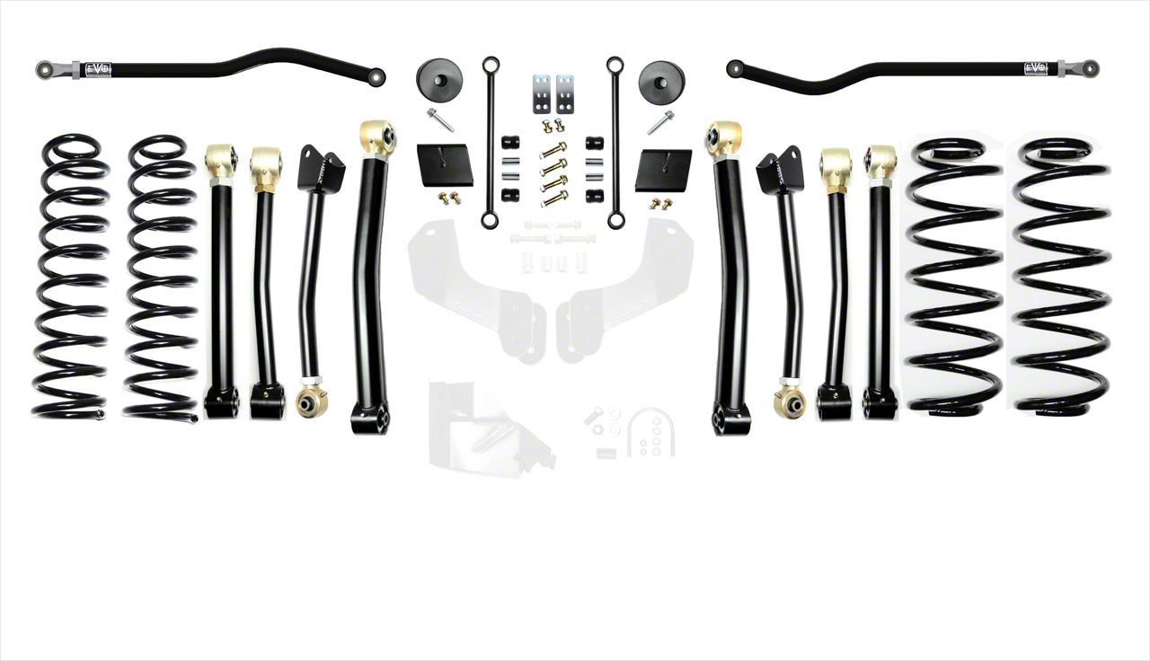 The EVO MFG 2.5” JL Enforcer Lift Suspension Systems lift your 2018+ Jeep Wrangler JL 2.5”s. Our main goal in developing this kit was to give a smooth ride on and off road while giving additional lift with increased performance.  The JL Enforcer kits are specifically designed to lift your JL and maintain compliant spring rate, smooth ride quality while having the option of retaining factory shocks, maintaining full wheel travel with use of shock extensions (part number EXT kits) or without shock extensions to allow for use of your choice of aftermarket 2/2.5” lift shocks. These kits come with a set of 2.5” Plush Ride Lift springs specific to each corner which will keep the Jeep Wrangler JL Level side to side and will maintain a unique and compliant ride quality. EVO MFG JL Enforcer kits are available in multiple configurations to suit your needs and budget and are upgradable down the road. These Enforcer kits will fit up to a 37” tires on Rubicon Model JLs or 35” tires on Sahara and Sport/S. The EVO MFG 2.5" JL Enforcer Kits are easy to install using normal tools. No drilling or cutting (optional rear shock extensions require one minor drill). They require no driveshaft or exhaust modifications (your shock choice may require this, contact manufacturer to be sure). Simple Bolt on installation. 2.5” lift is based on increase of a 4 Door Rubicon.  4 Door Sport and Sahara Models will see slightly higher increases over stock and will match overall lift height of a Rubicon Model.  2 Door Models (all) will see slightly higher increases in lift.  Increases will vary. Stage 1 kits includes all the necessary parts to lift your JL 2.5”s. Stage 2 kits includes Stage 1 components as well as EVO MFG Enforcer JL Front Lower Adjustable Control Arms to allow for caster adjustments. Stage 3 Kits includes stage 2 components as well as EVO MFG Enforcer rear upper adjustable control arms for rear pinion angle adjustment Stage 4 kits includes stages 1 components with all 8 EVO MFG Enforcer control arms for full front and rear axle adjustments. *All part number “EXT” kits include front and rear shock extensions. Retaining factory shocks while maintaining full wheel travel Note:  Depending on actual tire variances and sizes, Some minor factory inner liner plastic may need to trimmed/removed to fully clear some tires under compression.  These kits require wheel spacers or aftermarket wheels with smaller backspacing. Front and rear adjustable trackbars are included with PLUS “P” kits.