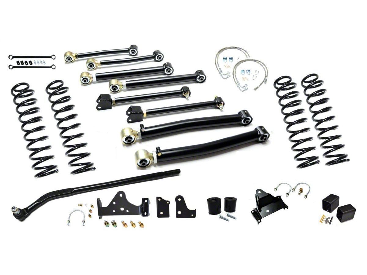 All stages include the EVO MFG Draglink Flip Kit, when lifting your JK 3” or greater, it is highly recommended to correct some of the steering geometry that has been altered with the lift. The EVO MFG JK Draglink Flip Kit does just that and more. Raises trackbar mounting location 3” at the axle to help correct roll center and steering angles of a lifted JK. Roll center is greatly improved giving better handling of the vehicle on and off-road Complete bolt-on design that gives greater strength to already prone to failure factory front trackbar bracket