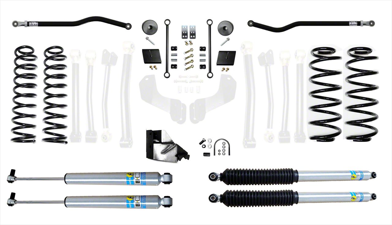 Description. The EVO MFG 3.5 Inch JLU High Clearance Long Arm kit will like your JLU 3.5 Inchs. Through specifically designed bracketry we accomplish the ultimate in suspension and chassis clearance, larger wheel travel ability, optimal suspension geometry with increased ride quality. Clearance, ride quality, performance and ease of installation was our focus in creating this long arm suspension system. The front arms mount tucked up inside nearly flush with the bottom of the frame mounting inches above the stock front lower mounting bracket. The rear mounting locations for the long arm are on the side of the frame, above the bottom giving inches of clearance over the factory locations as well.  Keeping optimal geometry while maintaining as much clearance was critical in the design of this system. In doing so, not only did we raise the rear control above the frame but we raised its mounting at the rear axle by multiple inches as well. This allows for an incredible ground clearance increase but just as importantly retaining flat and optimal control arm angles giving ideal ground clearance, smooth ride quality and long travel ability. The mounting brackets are specifically designed to require no exhaust cutting on 3.6L Jeep Wrangler JLU's (minor grind/clearance to flange required) and have full length hard-face mounting surfaces that weld to your frame giving redundant and ample welding area and strength to their mounting. The mounting brackets align to the frame simply using existing factory holes giving complete assurance of proper locating during install. Simply bolt brackets up to frame with existing hardware and weld them in place. These kits come with a set of 3.5 Inch Plush Ride Lift springs specific to each corner which will keep the Jeep Wrangler JLU more level side to side and will maintain a unique and compliant ride quality. EVO MFG Long Arm joints feature Johnny Joints on both ends of the control arms for restriction free articulation and motion with no wearable and limited bond rubber. All long arms come complete with EVO1 on vehicle adjuster making alignment a snap allowing for the ability to adjust control arm lengths while completely installed on the vehicle at all times. All EVO MFG lower long arms are built with strength in mind. These arms are made from industry leading 2.0 Inch x .281 Inch wall Steel DOM Tubing. Include in these kits is front brakeline extension brackets, Rear swaybar endlinks and front and bumpstop extensions. Cutting, grinding and welding of frame brackets required. The EVO MFG 3.5 Inch High Clearance Long Arm kits require no driveshaft or exhaust modifications (your shock choice may require this, contact manufacturer to be sure). Option of retaining factory shocks, maintaining wheel travel with use of shock extensions (part number EXT kits) or without shock extensions to allow for use of your choice of aftermarket 3/5 Inch lift shocks. EVO3015K kits come with EVO SPEC King 2.5 Inch Remote Reservoir shocks all 4 corners. 3.5 Inch lift is based on increase of our 4 Door Rubicon. 4 Door Sport and Sahara Models will see slightly higher increases over stock and will match overall lift height of a Rubicon Model. 2 Door Models (all) will see slightly higher increases in lift. Increases will vary. Note:  Depending on actual tire variances and sizes, Some minor factory inner liner plastic may need to trimmed/removed to fully clear some tires under compression. These kits require wheel spacers or aftermarket wheels with smaller backspacing. Adjustable Front Trackbar is required to complete proper installation, Front and rear adjustable trackbars are included with PLUS “P Inch kits..