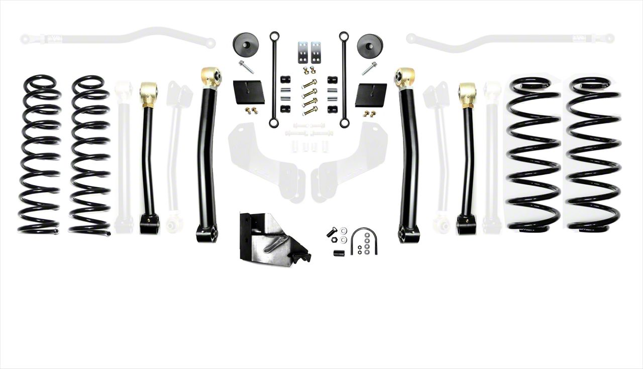 Stage 3 Performance Package. The EVO Manufacturing 4.50-Inch Enforcer Stage 3 Suspension Lift Kit is engineered for serious off-roaders, combining heavy-duty components with advanced suspension tuning. It includes front and rear adjustable control arms, progressive coil springs, sway bar end links, and track bar brackets for maximum strength and articulation.