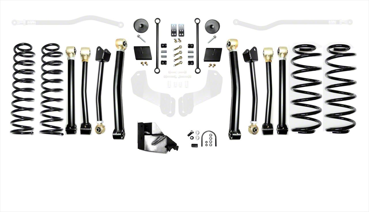 Installation. The EVO Manufacturing 4.50-inch Enforcer Stage 4 Suspension Lift Kit lifts both the front and rear of the Jeep to improve ground clearance and off-road capability. Installation involves replacing the factory suspension components, which requires mechanical expertise and alignment post-installation.