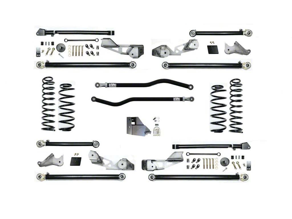 Made for the Extremes. The EVO Manufacturing 4.50-Inch High Clearance Long Arm Suspension Lift Kit with Front and Rear Track Bars delivers a superior lift for enhanced ground clearance and off-road capability. This lift kit improves wheel travel and articulation, making it perfect for Jeep enthusiasts looking to tackle extreme terrain without compromising performance on the road.