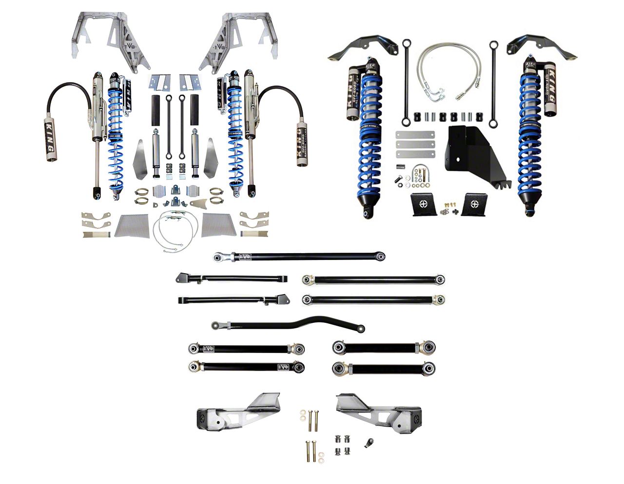 Application. This EVO Manufacturing 2.50-Inch Front Double Throw Down Long Arm Suspension Kit with King 2.5 Coil-Overs fits all 2020-2026 3.6L Jeep Gladiator JT models.