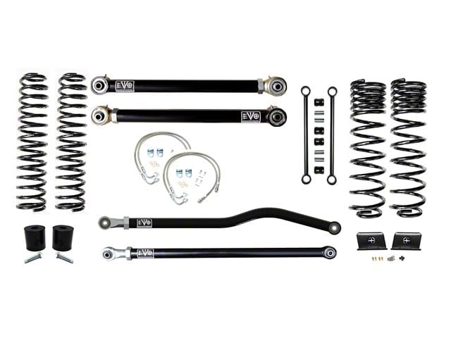 Description. The EVO MFG 2.5” Jeep Gladiator JT Enforcer Suspension Systems lift your 2020+ Jeep Gladiator JT 2.5”s. The JT Enforcer kits are specifically designed and engineered to lift your JL and maintain a performance spring rate, smooth ride quality all while retaining tow capacities. These kits allow for use of your choice of any aftermarket 2.5-5” lift shock or use of our EVO SPEC tuned 2.5” Remote Reservoir King Shocks. These kits come with a set of 2.5” lift springs specific to each corner which will keep the Jeep Gladiator JT level side to side. The EVO MFG 2.5" JT Enforcer Kits are easy to install using normal tools. No drilling or cutting. They require no driveshaft or exhaust modifications. Simple Bolt on installation. EVO MFG JT Enforcer kits are available in multiple configurations to suit your needs and budget and are upgradable down the road. Stage 1 kits includes all the necessary parts to lift your JT 2.5”s. Stage 2 kits includes Stage 1 components as well as EVO MFG Enforcer Front Lower Adjustable Control Arms to allow for caster adjustments. Stage 3 Kits includes stage 2 components as well as EVO MFG Enforcer rear upper adjustable control arms for rear pinion angle adjustment. Stage 4 kits includes stages 1 components with all 8 EVO MFG Enforcer control arms for full front and rear axle adjustments. All included Enforcer Arms use only rebuildable free articulating spherical bearings on all ends of each arm giving restriction free travel and articulation. The included Enforcer arms are manufactured from large diameter, thick DOM Steel Tubing for ultimate in strength and longevity both on and off the trail. These kits require wheel spacers or aftermarket wheels with smaller backspacing. Front and rear adjustable trackbars to fine tune axle center are included with PLUS “P” kits. “K” Kits include a set of 4 EVO SPEC King Shocks.