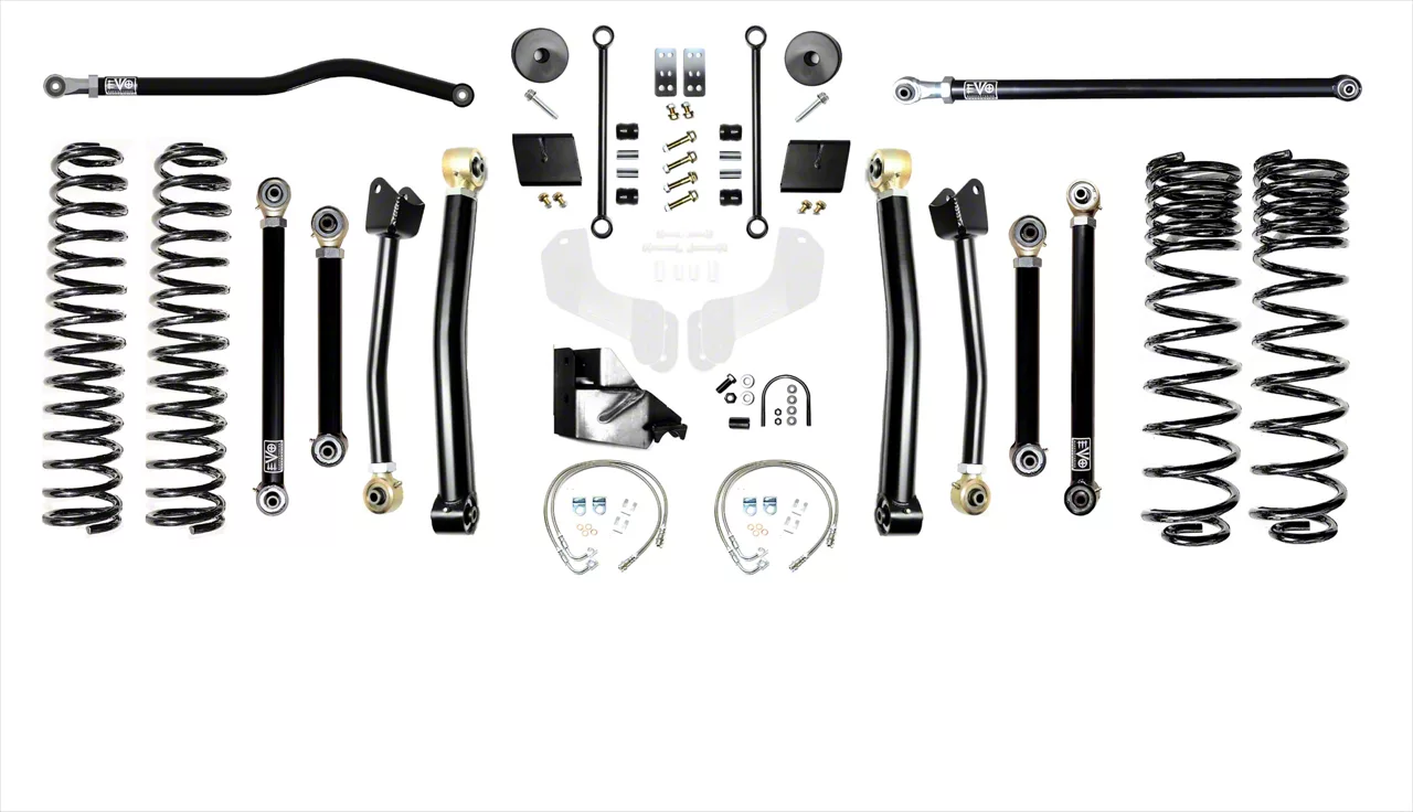 Full Lift. Made for the Jeep Gladiator JT, this EVO Manufacturing Enforcer Suspension Lift Kit promises a full vehicle lift of 6.50 inches. This stage 4 kit comes complete with coil springs, upper and lower control arms, track bars, and its installation hardware to make it compatible with up to 37-inch wheels.