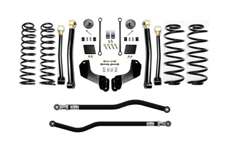 Description. The EVO MFG 2.5” JL Enforcer Lift Suspension Systems lift your 2018+ Jeep Wrangler JL 2.5”s. Our main goal in developing this kit was to give a smooth ride on and off road while giving additional lift with increased performance. The JL Enforcer kits are specifically designed to lift your JL and maintain compliant spring rate, smooth ride quality while having the option of retaining factory shocks, maintaining full wheel travel with use of shock extensions (part number EXT kits) or without shock extensions to allow for use of your choice of aftermarket 2/2.5” lift shocks. These kits come with a set of 2.5” Plush Ride Lift springs specific to each corner which will keep the Jeep Wrangler JL Level side to side and will maintain a unique and compliant ride quality. EVO MFG JL Enforcer kits are available in multiple configurations to suit your needs and budget and are upgradable down the road. These Enforcer kits will fit up to a 37” tires on Rubicon Model JLs or 35” tires on Sahara and Sport/S What are the JL Enforcer OVERLAND Systems, EVO-3012 Kits? The difference with EVO MFG Enforcer Overland systems (EVO-3012s) vs EVO MFG Enforcer systems (EVO-3011s) is the use of front Overland Control Arm Brackets. When lifting your vehicle your control arms at ride height have a steeper angle towards the floor which can have some negative effect/chop in ride quality. With the use of the included Overland Control Arm brackets we relocate the front control arm mounting locations at the frame. In doing this when lifted we maintain factory flatter control arm angles and while minimal, we alleviate much of the chop associated with lifting a Jeep giving even better and more improved ride quality. Also, in the use of Overland Drop Brackets we are able to engineer more performance into the front suspension to improve braking and driveline angles through suspension cycle. Both kits drive very well, the Overland Kits are better suited for less hard off-road crawling and more light off road and on road use. The EVO MFG 2.5" JL Enforcer Overland Kits are easy to install using normal tools. No drilling or cutting (optional rear shock extensions require one minor drill). They require no driveshaft or exhaust modifications (your shock choice may require this, contact manufacturer to be sure). Simple Bolt on installation. 2.5” lift is based on increase of a 4 Door Rubicon. 4 Door Sport and Sahara Models will see slightly higher increases over stock and will match overall lift height of a Rubicon Model. 2 Door Models (all) will see slightly higher increases in lift. Increases will vary. Stage 1 kits includes all the necessary parts to lift your JL 2.5”s. Stage 2 kits includes Stage 1 components as well as EVO MFG Enforcer JL Front Lower Adjustable Control Arms to allow for caster adjustments. Stage 3 Kits includes stage 2 components as well as EVO MFG Enforcer rear upper adjustable control arms for rear pinion angle adjustment Stage 4 kits includes stages 1 components with all 8 EVO MFG Enforcer control arms for full front and rear axle adjustments. *All part number “EXT” kits include front and rear shock extensions. Retaining factory shocks while maintaining full wheel travel Note: Depending on actual tire variances and sizes, Some minor factory inner liner plastic may need to trimmed/removed to fully clear some tires under compression. These kits require wheel spacers or aftermarket wheels with smaller backspacing. Front and rear adjustable trackbars are included with PLUS “P” kits.