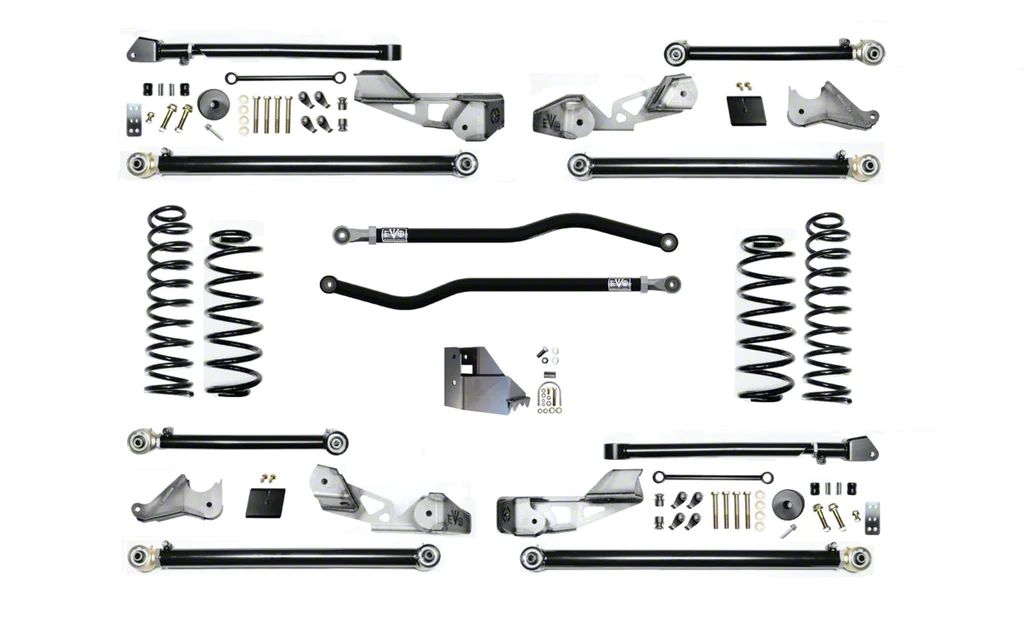 Transformative Off-Road Suspension Upgrade. The EVO Manufacturing Long Arm Suspension Kit is engineered to elevate your Jeep Wrangler JL's off-road capabilities. With a lift of 3.50 inches, this high clearance model provides larger wheel travel and improved control, making it perfect for rugged terrains.