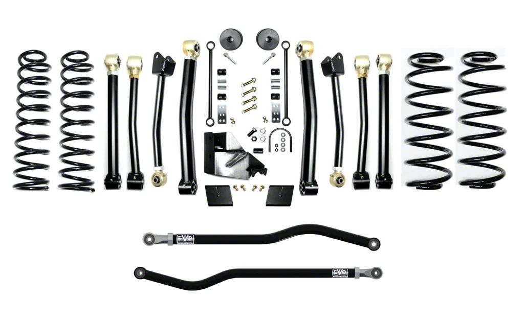 Substantial Off-Road Enhancement. The EVO Manufacturing Enforcer Suspension Lift Kit, Stage 4, is tailored for 2018-2026 2.0L or 3.6L Jeep Wrangler JL models, offering a substantial 4.5-inch lift. This kit is specifically excluded for 4xe models and includes front and rear track bars, four coil springs, and both upper and lower adjustable control arms. The comprehensive set of components ensures significantly improved off-road capabilities, enhancing both ride quality and comfort.