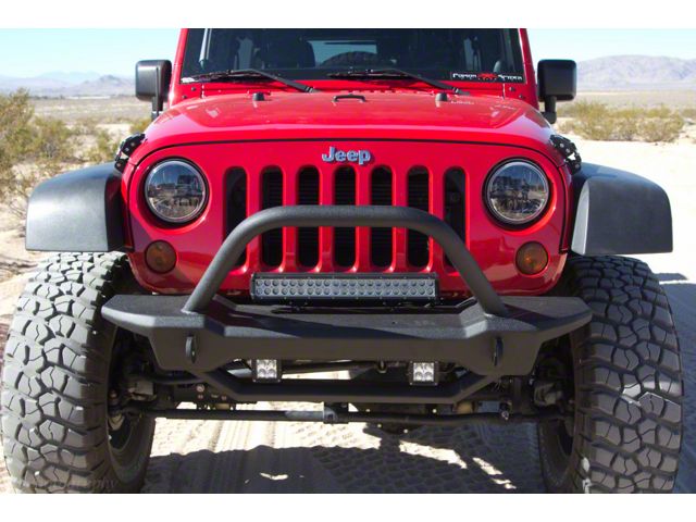 Designed to be a perfect match to our popular High Clearance Rear Bumper, this one has it all! Our bumpers offer Hi Lift jacking points on each corner that are strong enough to lift your Jeep completely off the ground. They are built into our one of a kind, high clearance corners. These corners are designed to give you the protection you want, and the ground clearance that you need to take on even the toughest trails. Built from 3/16 plate steel, they are also made to last. Fully boxed and gusseted corners offer superior strength compared to our competition. Available with either a stinger or a bull bar, you can customize this bumper to your liking. Other options include the winch tray, as well as the lower light enclosure. Mount up to a 20’’ light bar or a total of 4 pods. This mounting location keeps the light down low where you need it, and is strong enough to protect them. It does require the removal of the factory crash bar to be able to utilize the light enclosure, but this makes it possible to gain approach angle and ground clearance over the factory set up!