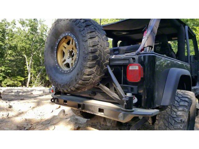The NBO Series Rear Bumper for TJ/LJ is most closely resembled by the TSC Bumper that has the tire swing add on (pictured). The NBO Rear for TJ/LJ DOES NOT INCLUDE THE TIRE SWING. The NBO Series Rear Bumper is 2 inches shorter from front to back (front to back of the Jeep), but has an identical resemblance to the TSC Bumper. This bumper requires the removal of rear body mounts on the chassis. They are relocated into the new rear bumper to achieve the ultimate bumper strength.