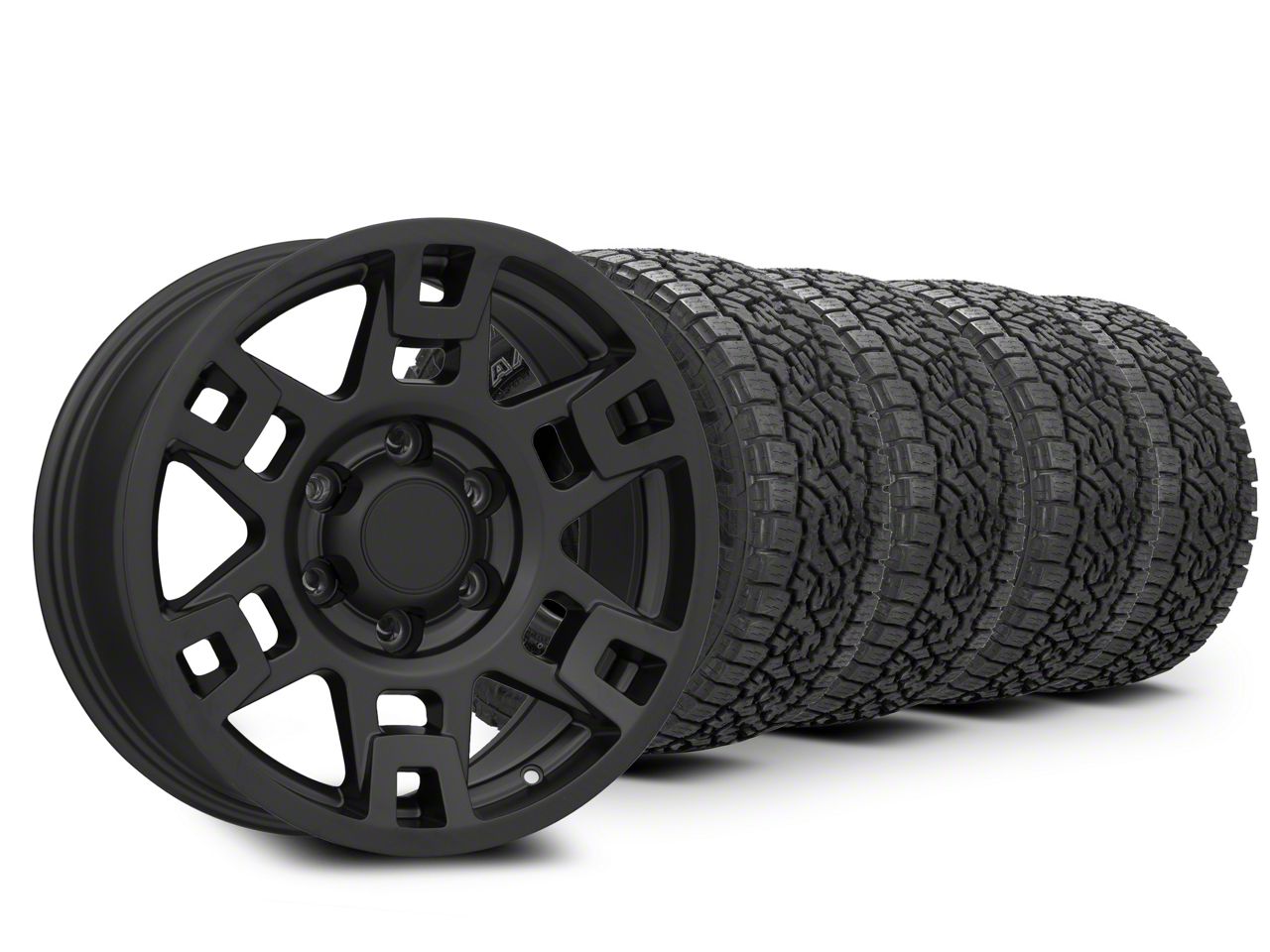 Mounted and Balanced Wheel and Tire Kit. This wheel and tire combo kit features (4) 17x8 TRD Style Matte Black 6-Lug Wheels and (4) Toyo All-Terrain Open Country A/T III 285/70R17 tires that have been put together into an easy to buy kit that arrives to your door already mounted and balanced ready to be installed on your vehicle.
