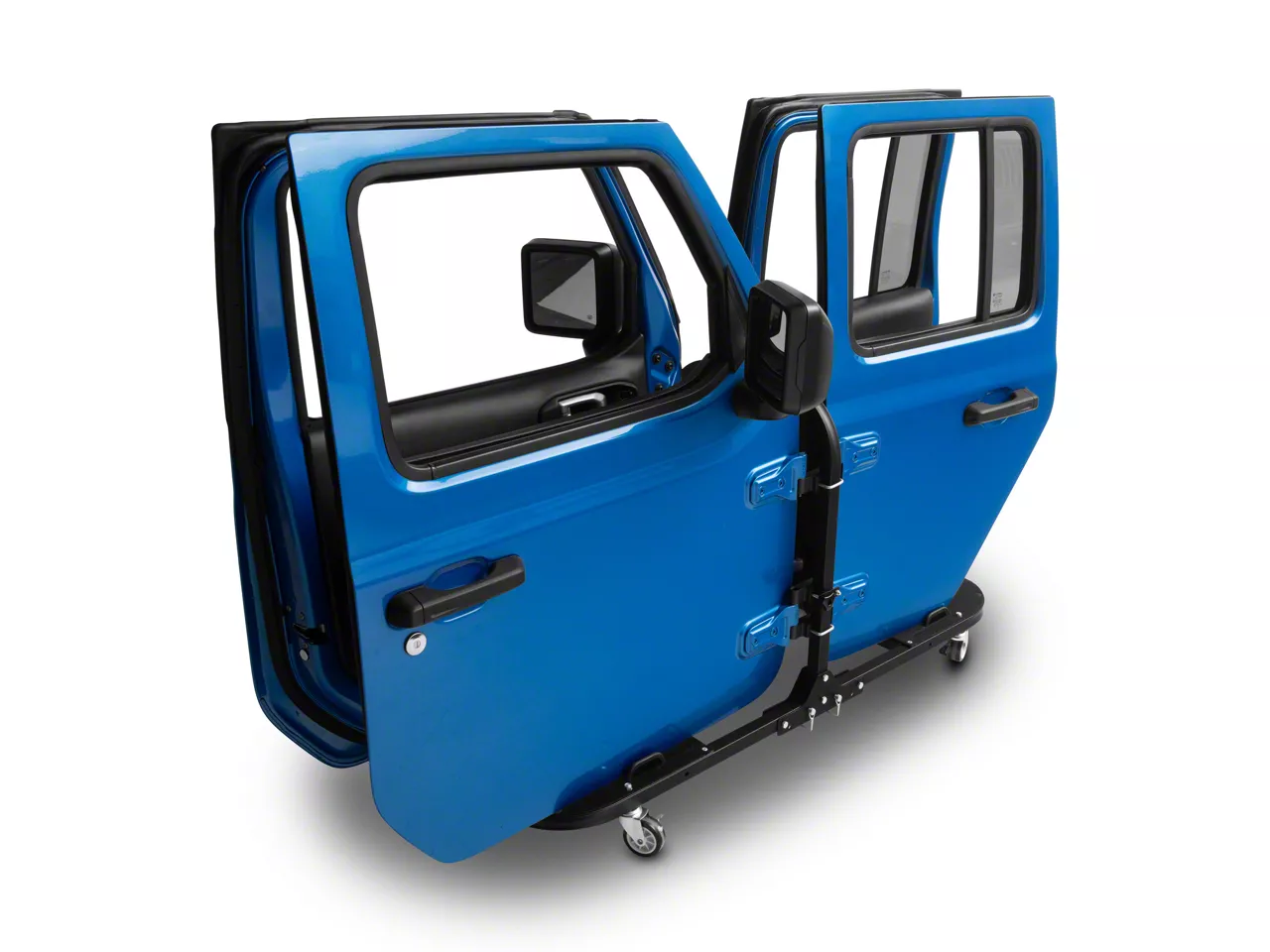 Secure. The EZ 4x4 4-Door Holder Aluminum Rolling Cart includes robust casters designed to handle the significant weight of Jeep doors effortlessly, ensuring smooth movement across various types of flooring. These heavy-duty casters are built to last and feature locking mechanisms that secure the cart in place, providing stability and safety when the cart is stationary. This functionality enhances safety during the loading and unloading process, preventing accidental movement that could lead to damage or injury.