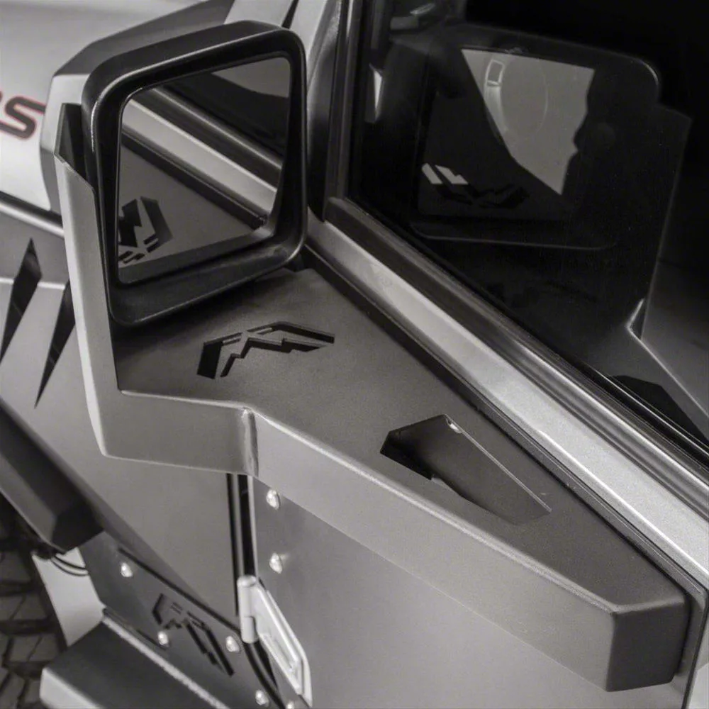 Beefy Steel Build. The Fab Fours Door Skin Mirror Guards consist of powerful steel materials that have been primed with a 2-phase textured black powder coat finish to further strengthen the component and protect it from chemical degradation.