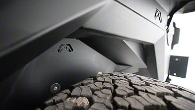 Tough US Steel. Constructed from 100% 11-Gauge US Steel, these Inner Fenders are built to withstand the toughest terrains, ensuring long-lasting durability. The Dual-Stage Matte Black Powder-Coated Finish not only adds a rugged aesthetic but also offers superior protection against the elements. The package includes a 16-Gauge Removable Skin, allowing you to customize your setup further.