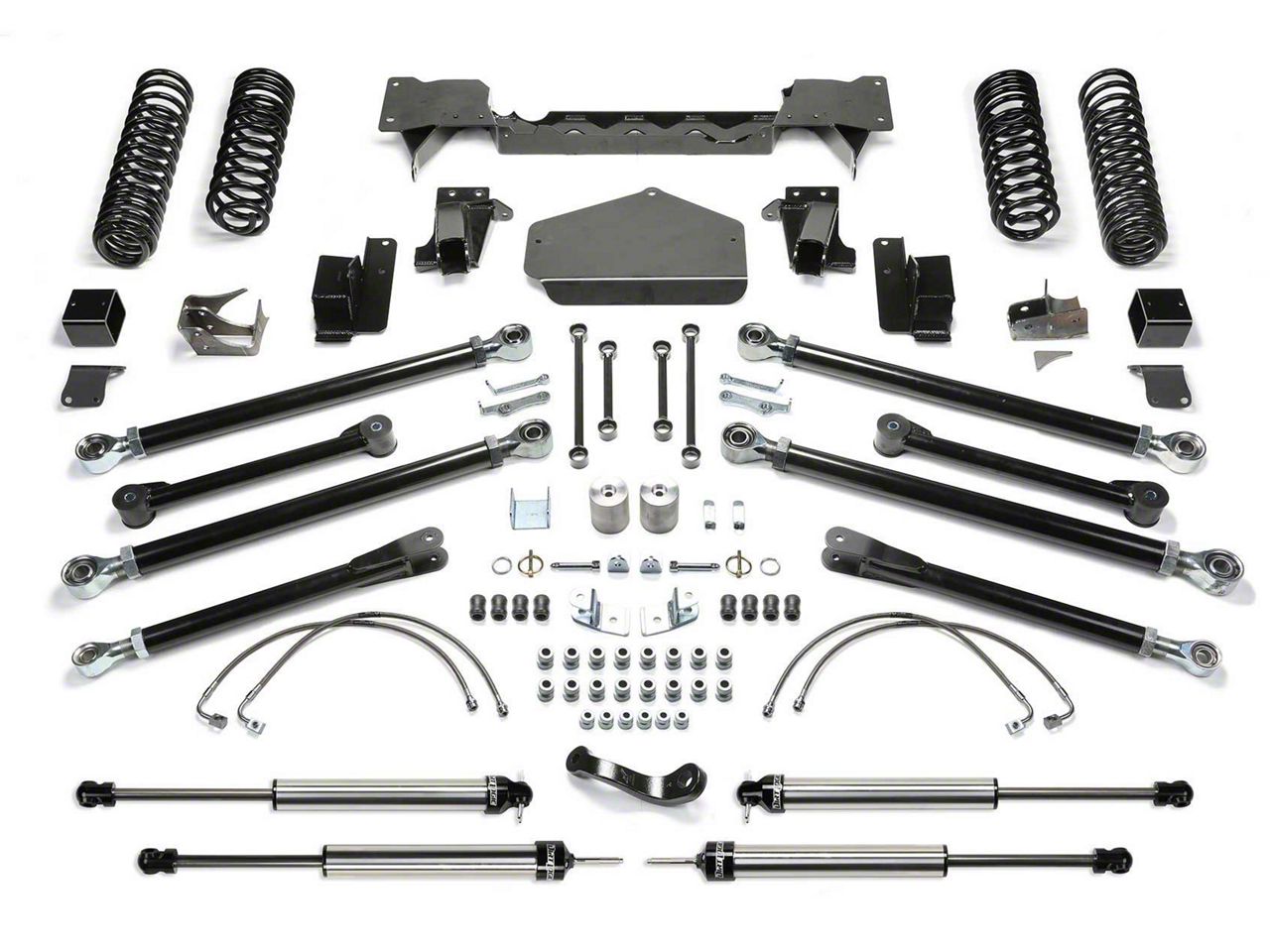Shocking. The Fabtech 5 inch Crawler Long Travel Lift Kit comes with Stealth Shocks. Each one features high-flow Nitrocarburized piston rods for unmatched corrosion resistance and durability. They're finished in matte black for a sleek look. Dirt Logic Non-Reservoir Shocks or Dirt Logic Reservoir Shocks are available options with this Lift Kit.