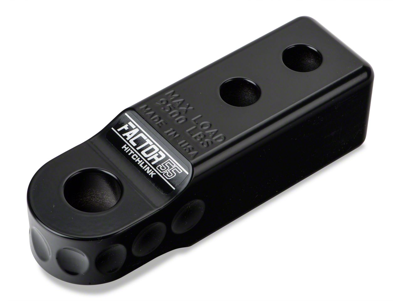 Specs. When you get stuck, you need every advantage that you can get. The Factor 55 aluminum hitch link can quickly turn your tow hitch into a recovery point by allowing you to mount a 3/4 inch D-link or shackle. This CNC machined, 6061-T6 aluminum hitch mount has a 51,000 pound ultimate failure limit, and it's rated for 9,500 pounds. When all else fails, this hitch link can handle the strain or recovery.
