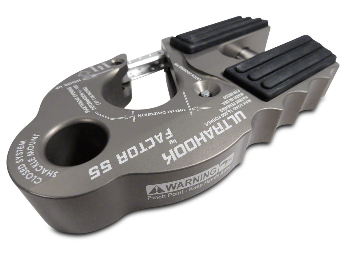 Safest Winch Hook Available. With its closed shackle mount, the Factor 55 UltraHook in gray is the safest winch hook in the industry for your Wrangler. The integrated shackle pin mount is secured by the hook's double locking safety clasp and is machined into the hook's body. The UltraHook is versatile because you can choose to use as a conventional hook opening or as a shackle mount. It can accommodate up to 3/8-inch steel cables or synthetic winch ropes.