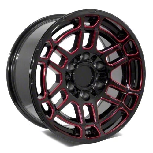 This 17x8.5 Factory Style Wheels 2022 Tac Pro Style Gloss Black Red Milled 6-Lug Wheel underwent a thorough finishing process with certain coatings providing added protection against environmental elements and daily wear. Aesthetically, this finish can significantly enhance the wheel's appearance, making it a standout feature.