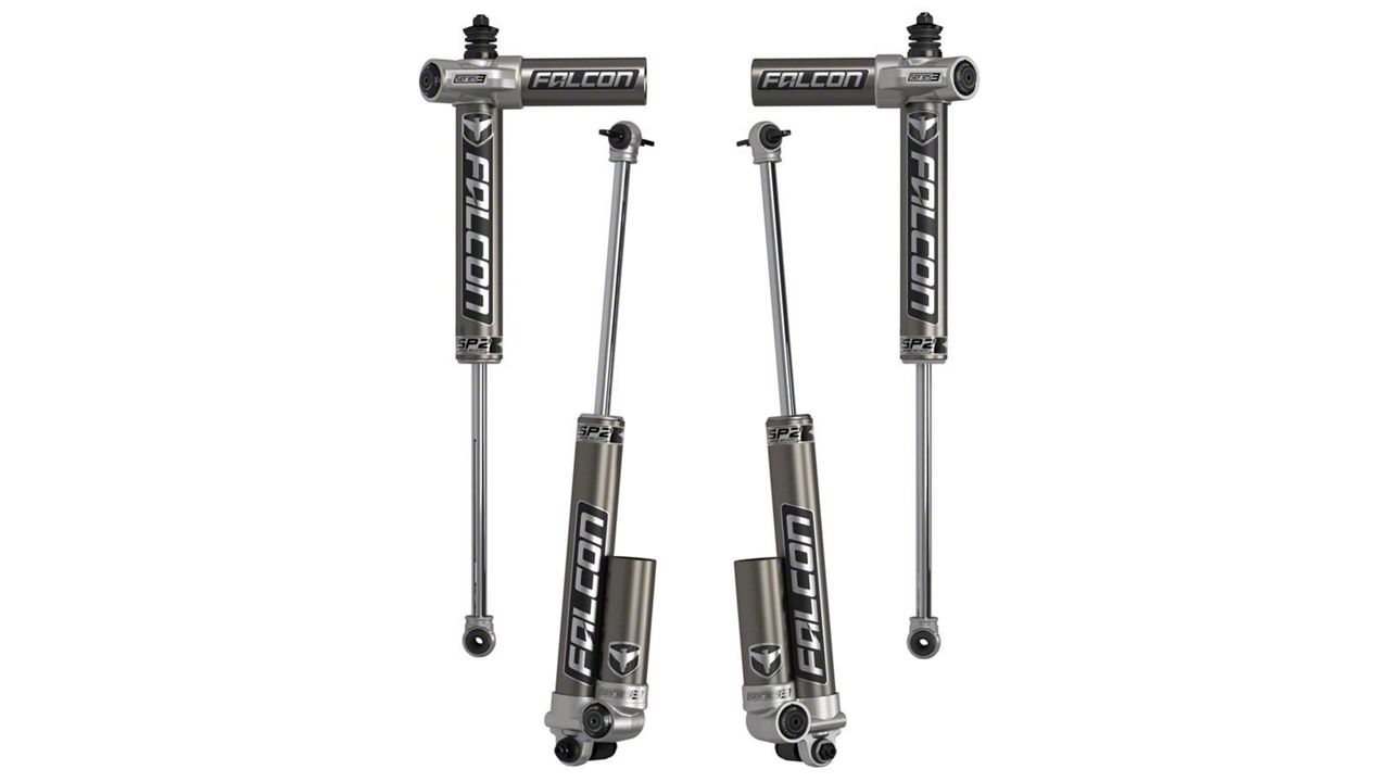 Description. Falcon SP2 3.1 Piggyback Shocks deliver increased stability, improved ride quality, and comfort on road, while the increased compression damping provides more aggressive off-road handling. SP2 3.1 Shocks have been optimized for on- and off-road driving. “High-Value Performance” is the driving force behind our vehicle-specific dampers for Jeeps, trucks, and SUVs. These Jeep-specific shock absorbers deliver increased stability, improved ride quality, and comfort for daily driven vehicles as well as race-inspired performance, handling, and stability for off-road rigs. Falcon Performance Shocks by TeraFlex. SP2 3.1 Piggyback: • SP2 3.1 Piggyback Shocks deliver increased stability, improved ride quality, and comfort on road, while the increased compression damping provides more aggressive off-road handling • Optimized tuning for on- and off-road driving • Ideal for daily driven Jeeps as well as the serious enthusiast wanting a consistent, controlled feel through all driving conditions JK Wrangler/Unlimited: • JK corner-specific shock absorber w/ race-inspired performance • Front upper offset stud design provides maximum shock body to frame clearance during articulation • Outboard mounting increases clearance for lifted vehicles w/ raised track bar brackets • Rear shock body (all) and reservoir (piggyback) positioned on bottom eliminates shaft damage from rocks kicked up by the tires • Rear Shock Skid Plates available separately Piggyback: • Piggyback design increases oil and gas capacity for reduced heat • Moving gas charge to piggyback reservoir allows maximum amount of travel • Flows 6x more oil than restrictive reservoir hose designs • Eliminates common leakage issues found in banjo and swivel fittings • Front shock’s unique horizontal piggyback reservoir increases tire clearance • Cartridge Upgrade Kits are available separately — contact customer service for details