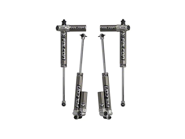 Safety and Stability. Upgrade your off-road experience with the Falcon Shocks SP2 3.1 Piggyback Front and Rear Shocks. This set of four shocks is specifically designed for vehicles lifted at 3 to 4.50 inches, providing a perfect fitment that enhances clearance and frame compatibility. These shocks are engineered to improve vehicle stability, offering better dynamic roll control for a safer and smoother ride.