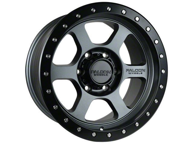 This 17x9 Falcon Wheels T1 Series Matte Gunmetal with Matte Black Ring 6-Lug Wheel is completed in a high-quality gunmetal finish with accents for a striking appearance. There's a durable clear coat to help protect against driving hazards.