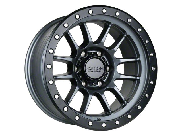 This 17x9 Falcon Wheels T7 Series Matte Gunmetal with Matte Black Ring 6-Lug Wheel; 17x9; 0mm Offset is completed in a matte gunmetal finish with accents to make everyone green with envy. There's a durable clear coat that looks amazing and withstands the rigors of daily driving.
