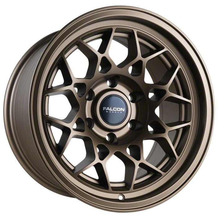 This 17x9 Falcon Wheels TX3 EVO Series Full Matte Bronze 6-Lug Wheel; 17x9; 0mm Offset is completed in a high-quality bronze finish that will make others green with envy. There is a durable clear coat that looks great and withstands the rigors of daily driving.