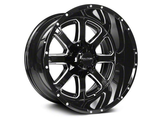 Falcon Wheels F1 Series Glossy Black with Diamond Milling 6-Lug Wheel; 20x10; -24mm Offset. The Falcon Wheels F1 Series Glossy Black with Diamond Milling 6-Lug Wheel offers a striking balance of style and refinement. Its unique design accentuates the vehicle's aesthetic, while the premium construction underscores its robust nature. This wheel is a perfect choice for those seeking both elegance and a strong visual statement.