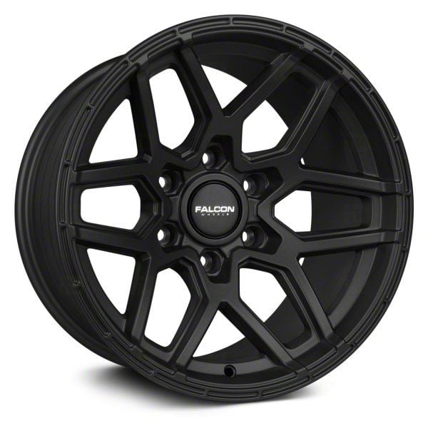 The 17x9 Falcon Wheels T9 Atlas Series Full Matte Black 6-Lug Wheel; 17x9; -15mm Offset is completed in a high-quality matte black finish that will make others green with envy. For added protection and good looks, this wheel features a durable clear coat that can withstand the hazards of daily driving.