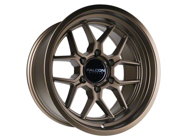 This 17x9 Falcon Wheels TX1 Apollo Series Full Matte Bronze 6-Lug Wheel; 17x9; -38mm Offset is completed in a high-quality bronze finish that will be the envy of everyone. For added protection and looks, there is a clear coat designed to handle whatever the road, or beyond, throws at it.