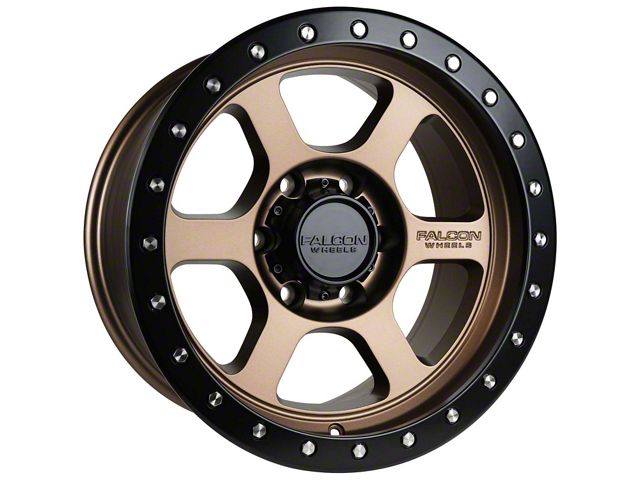 Falcon Wheels T1 Series Matte Bronze with Matte Black Ring 6-Lug Wheel; 17x9; 0mm Offset. The Falcon Wheels T1 Series Matte Bronze with Matte Black Ring 6-Lug Wheel offers a striking balance of style and refinement. Its unique design accentuates the vehicle's aesthetic, while the premium construction underscores its robust nature. This wheel is a perfect choice for those seeking both elegance and a strong visual statement.