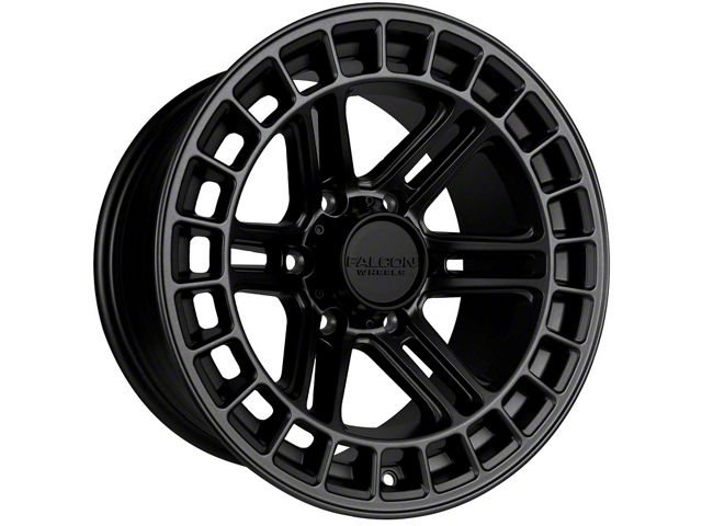 Falcon Wheels T5 Series Full Matte Black 6-Lug Wheel; 17x9; -12mm Offset exudes sophistication with its finish, offering a sleek and modern appeal to any vehicle it adorns. The design is meticulously crafted to enhance the aesthetic of your vehicle, giving it a distinctive and upscale look. Perfect for those seeking to elevate their vehicle's style, this wheel blends seamlessly with both contemporary and classic vehicle designs, making it a versatile choice for a wide range of vehicles. Its robust construction ensures durability, making it a reliable choice for drivers who value both style and quality.