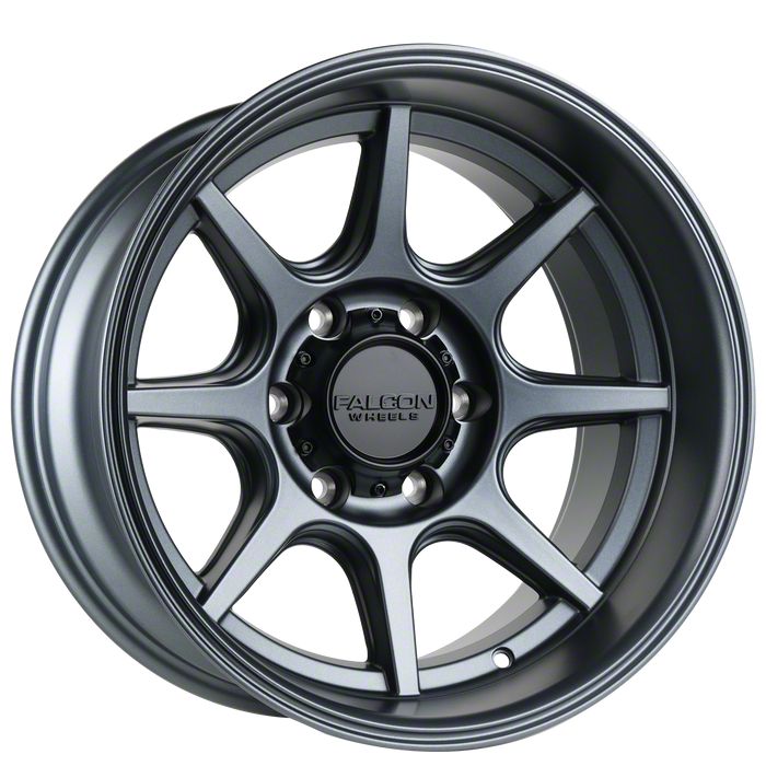 This 17x9 Falcon Wheels T8 Seeker Series Full Matte Gunmetal 6-Lug Wheel; 17x9; -38mm Offset is completed in a gunmetal finish to make everyone green with envy. There is a durable clear coat that looks amazing and withstands the rigors of daily driving.