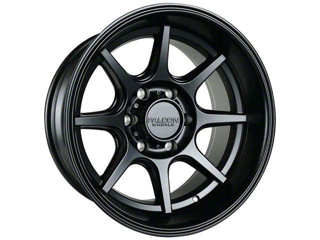 Falcon Wheels T8 Series Full Matte Black 6-Lug Wheel; 17x9 exudes an aesthetic appeal that seamlessly complements various vehicle styles. Manufactured by Falcon Wheels, its design emphasizes a premium and robust look, making it an ideal choice for those aiming to elevate their vehicle's appearance.