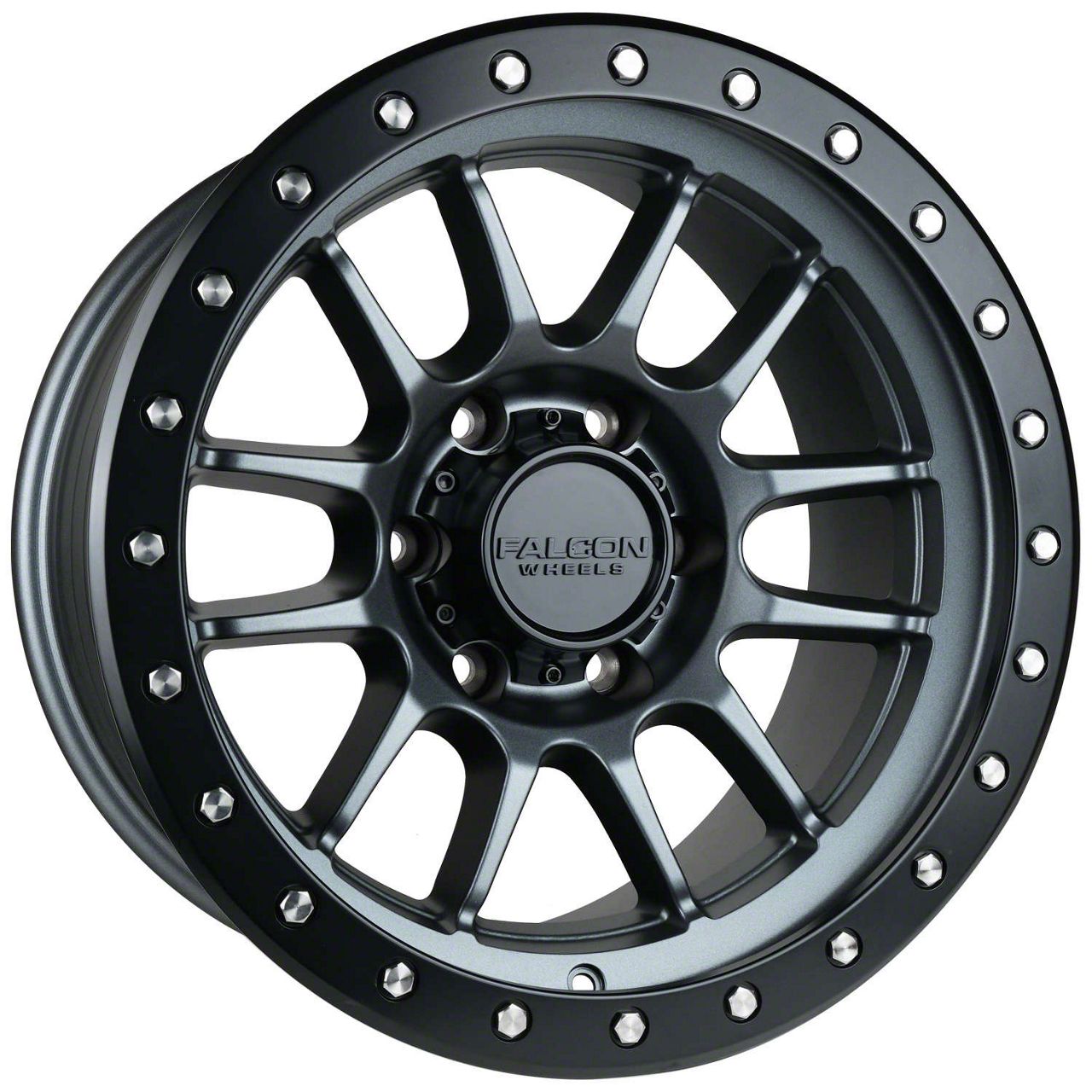 Falcon Wheels T7 Series Matte Gunmetal with Matte Black Ring 6-Lug Wheel; 17x9; -12mm Offset - Enhance your vehicle's style with the Falcon Wheels wheel. This wheel's distinctive design and finish complement your vehicle's aesthetics, making a bold statement. It's crafted to accentuate the unique character of your car, emphasizing a premium and robust appeal.